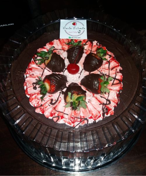 La combinación irresistible de chocolate y fresa crea una armonía de sabores que deleitará tus sentidos y te dejará deseando más. Cada rebanada es una experiencia gourmet, donde la suavidad del queque se fusiona con la frescura de la fresa y la cremosidad de la crema batida, creando un festín para el paladar que no querrás que termine.